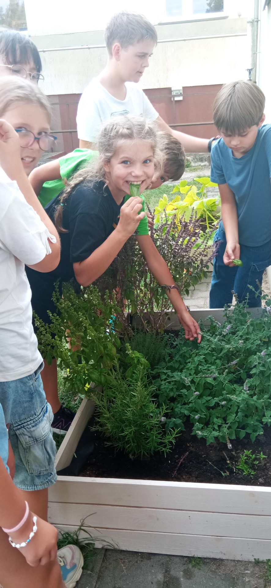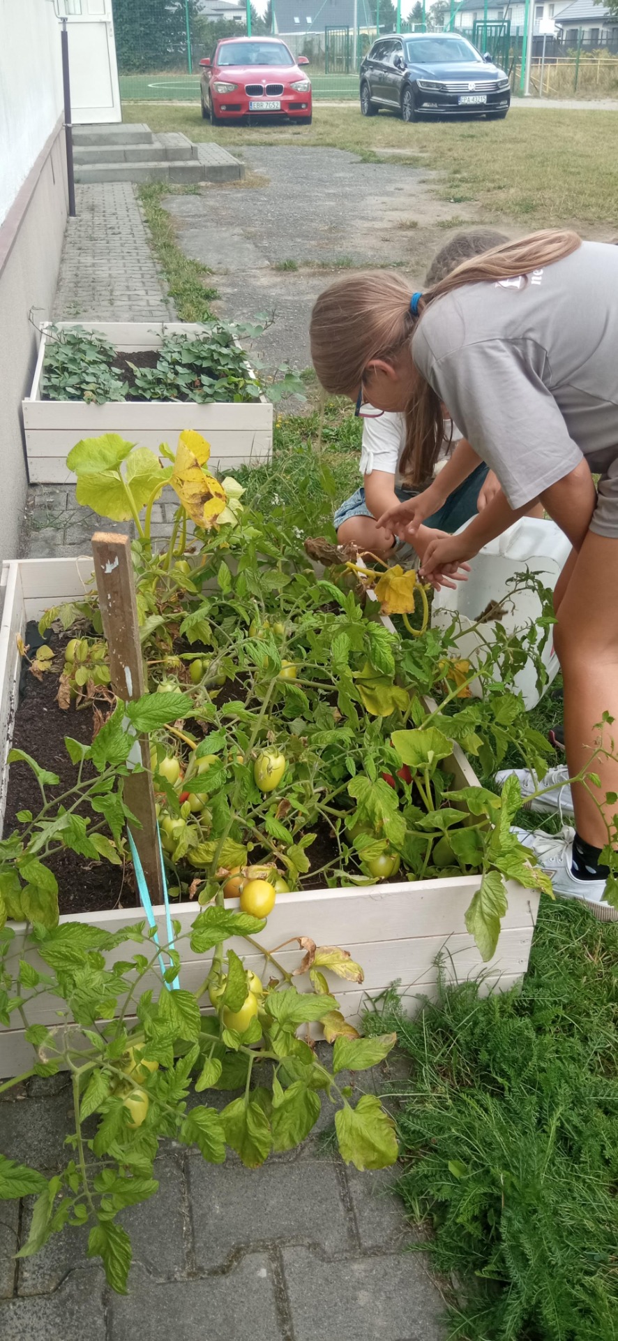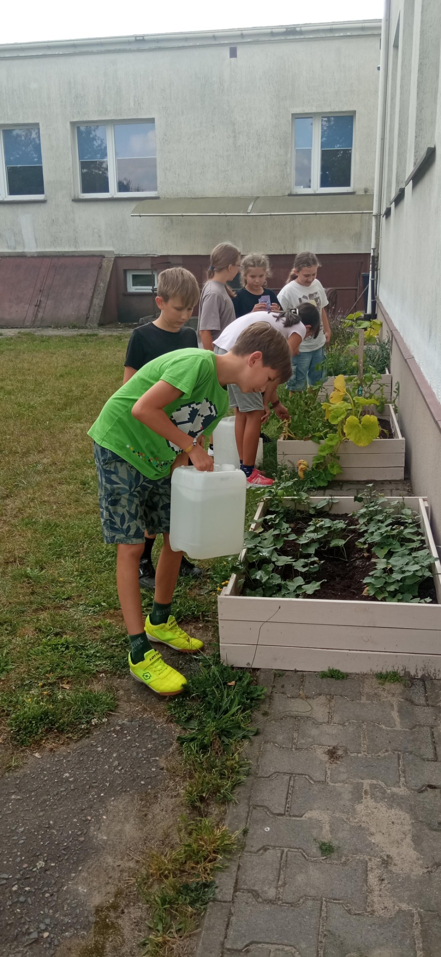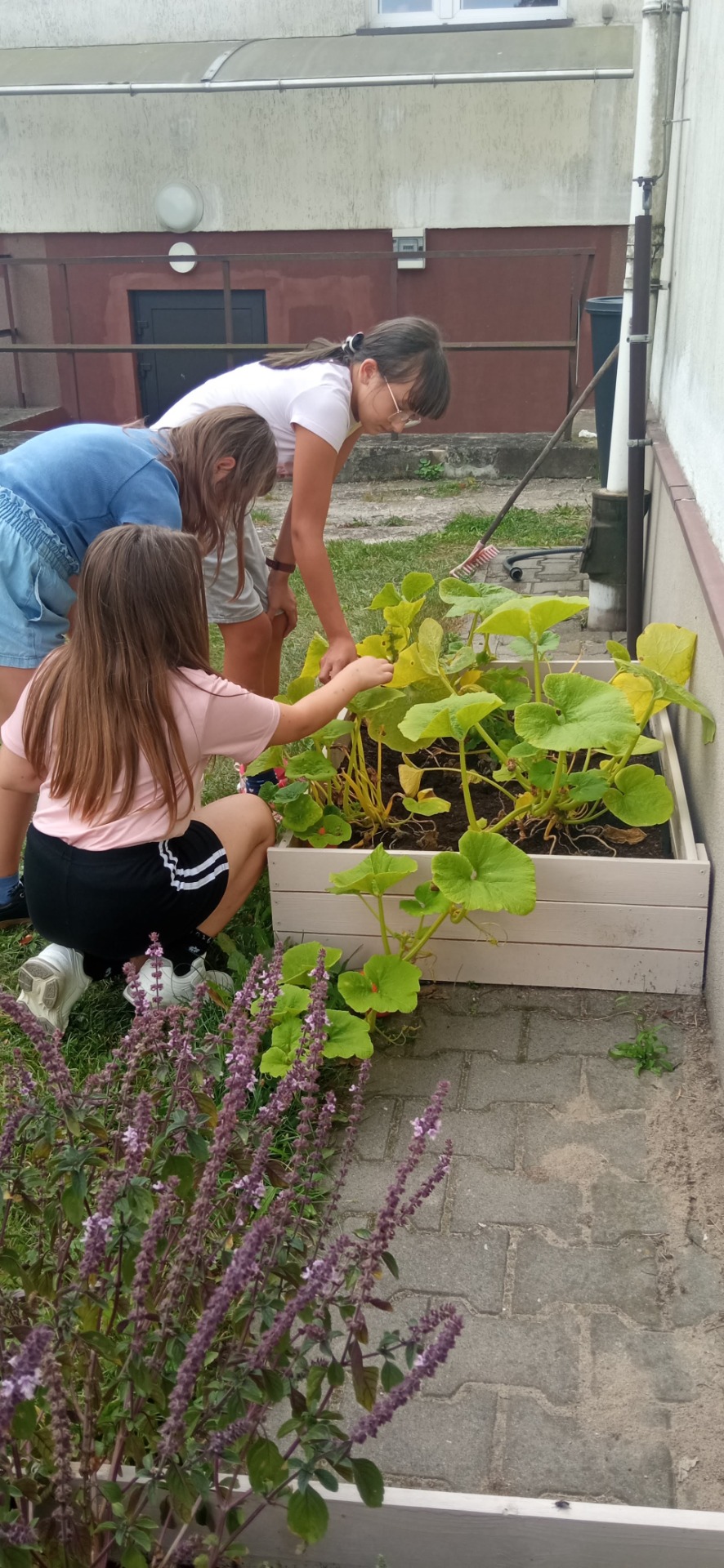 Uczniowie klasy V podczas prac w ogródku szkolnym