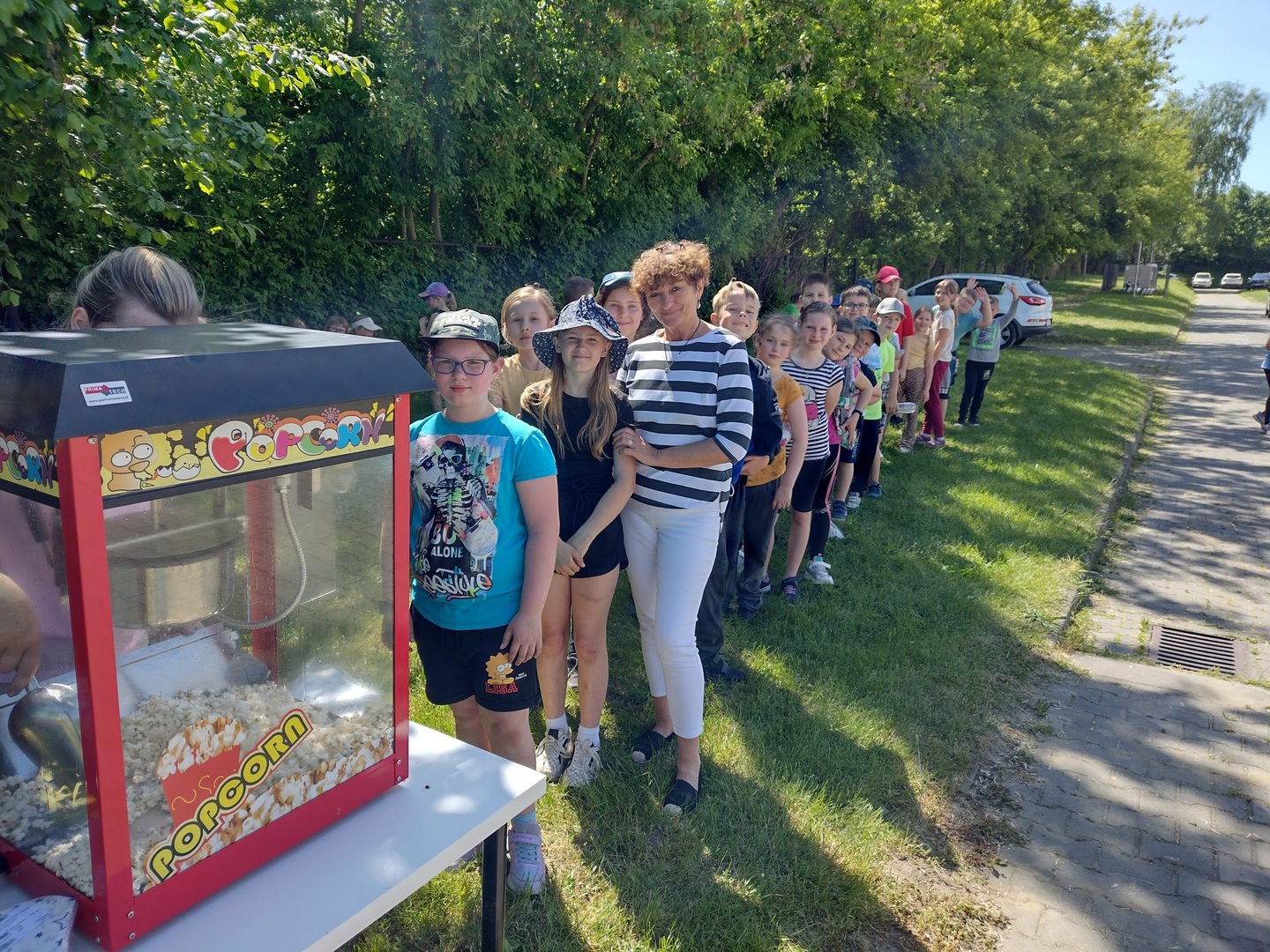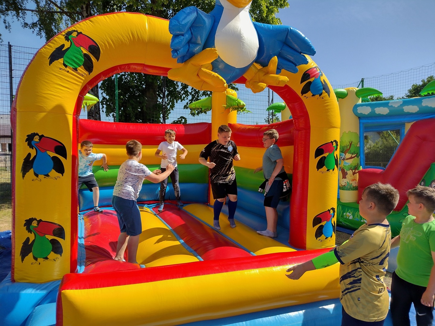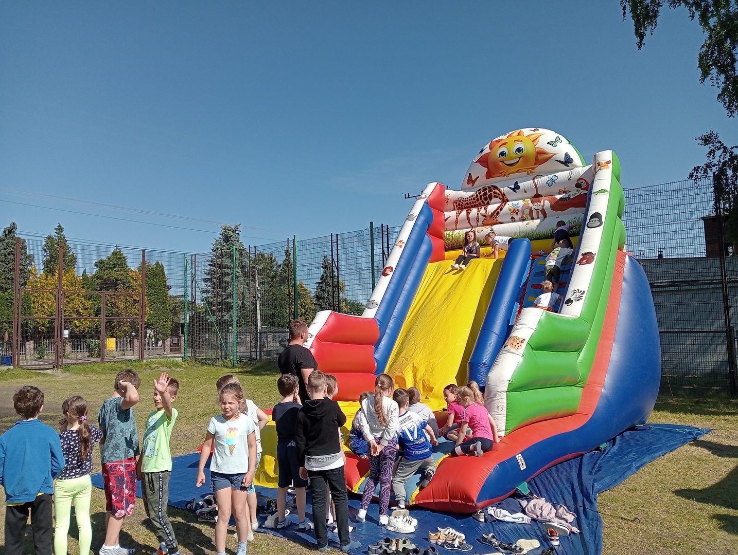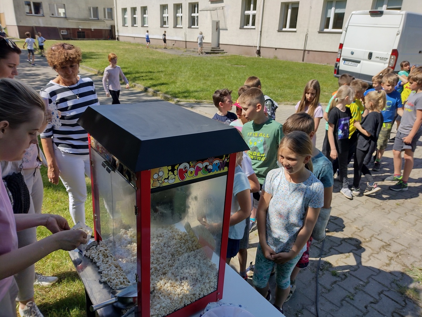 Największą atrakcją, szczególnie dla najmłodszych uczniów, okazały się dmuchańce. Starsi uczniowie uczestniczyli w warsztatach plastycznych, grach i zabawach ruchowych na hali, samodzielnie wykonywali jogurt owocowy a na koniec schrupali popcorn.
