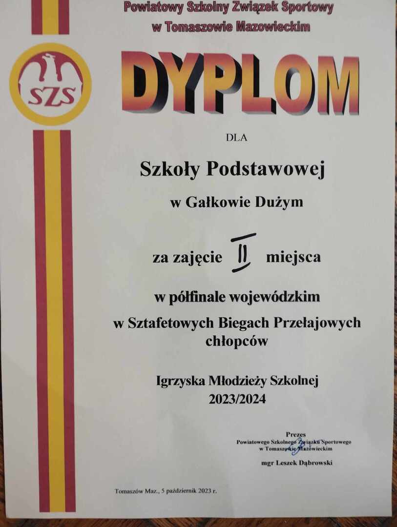 dyplom - 2 miejsce w półfinale wojewódzkim w Sztafetowych Biegach Przełajowych chłopców