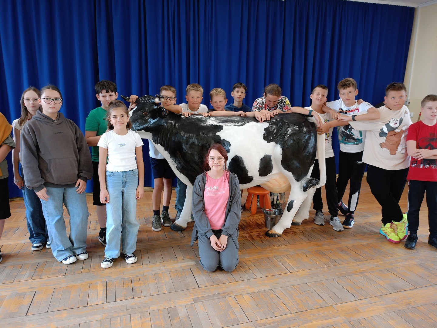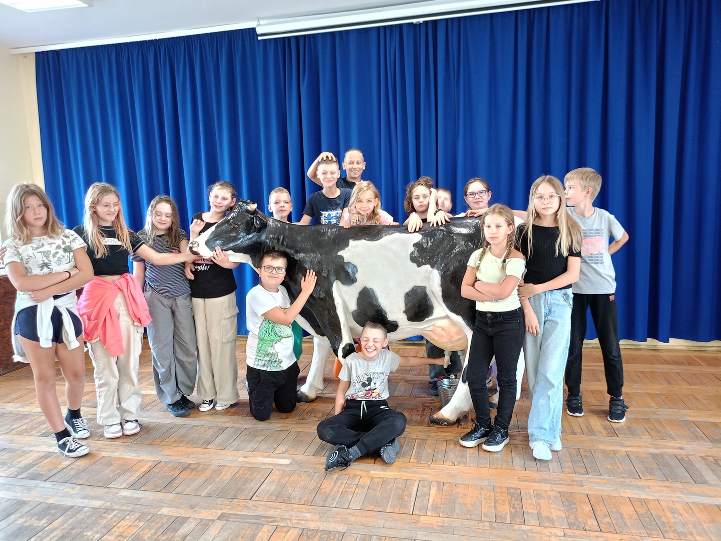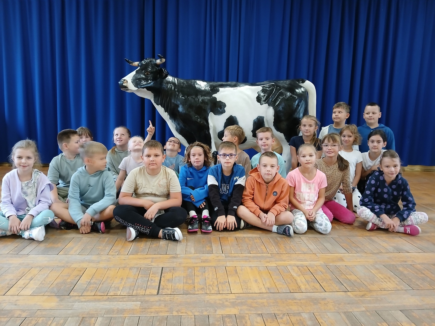 Lekcja była nie tylko edukacyjna, ale też bardzo interaktywna – uczniowie z entuzjazmem opisywali i rysowali wygląd zwierzęcia z uwzględnieniem różnych szczegółów. Wizyta sztucznej krowy okazała się świetną okazją do nauki poprzez zabawę. Dzięki tej innowacyjnej formie edukacji, uczniowie mogli w praktyce zrozumieć, skąd pochodzi mleko, które na co dzień widzą na stołach i piją. Wydarzenie to z pewnością na długo zostanie w pamięci zarówno uczniów, jak i nauczycieli.