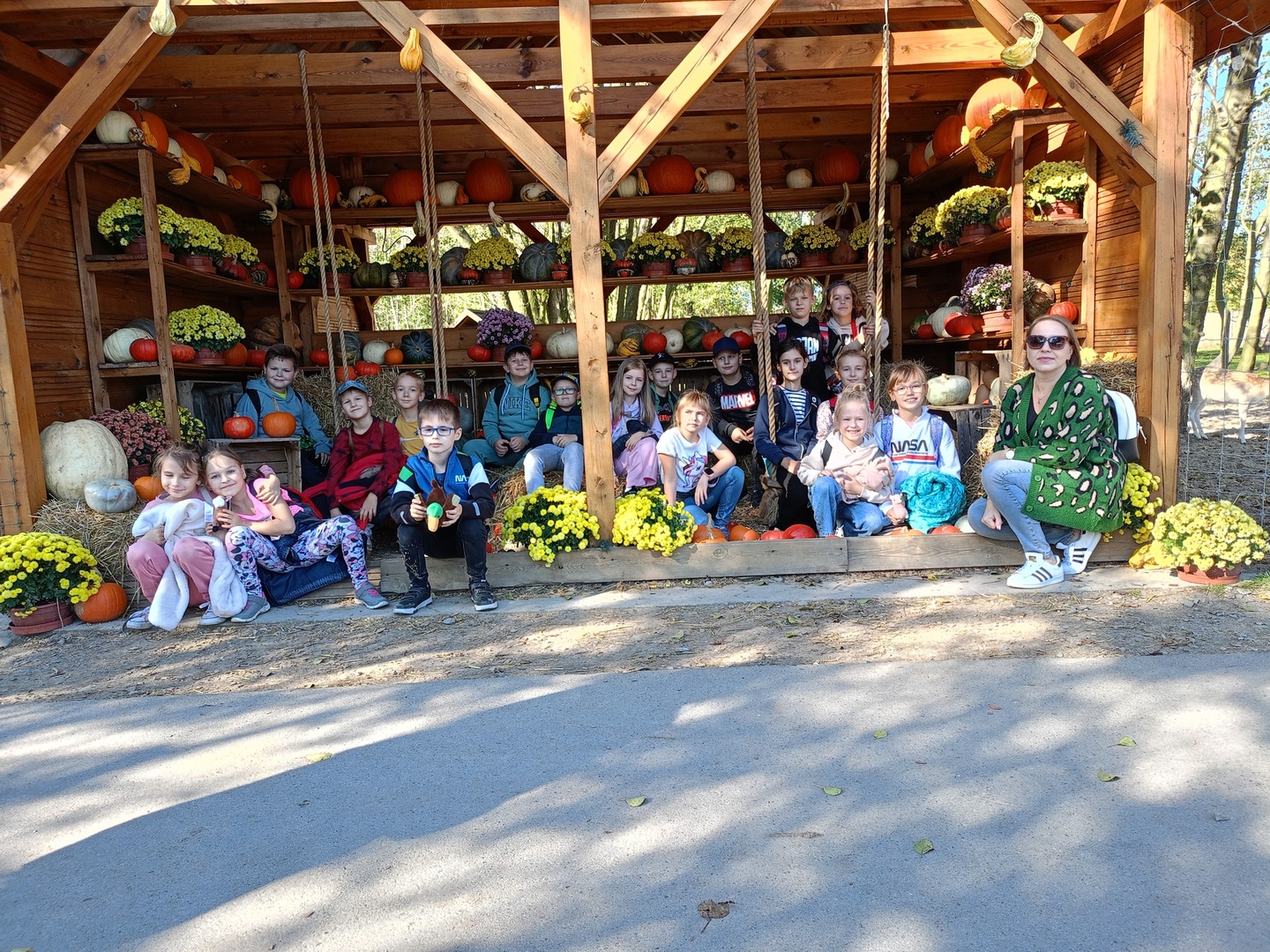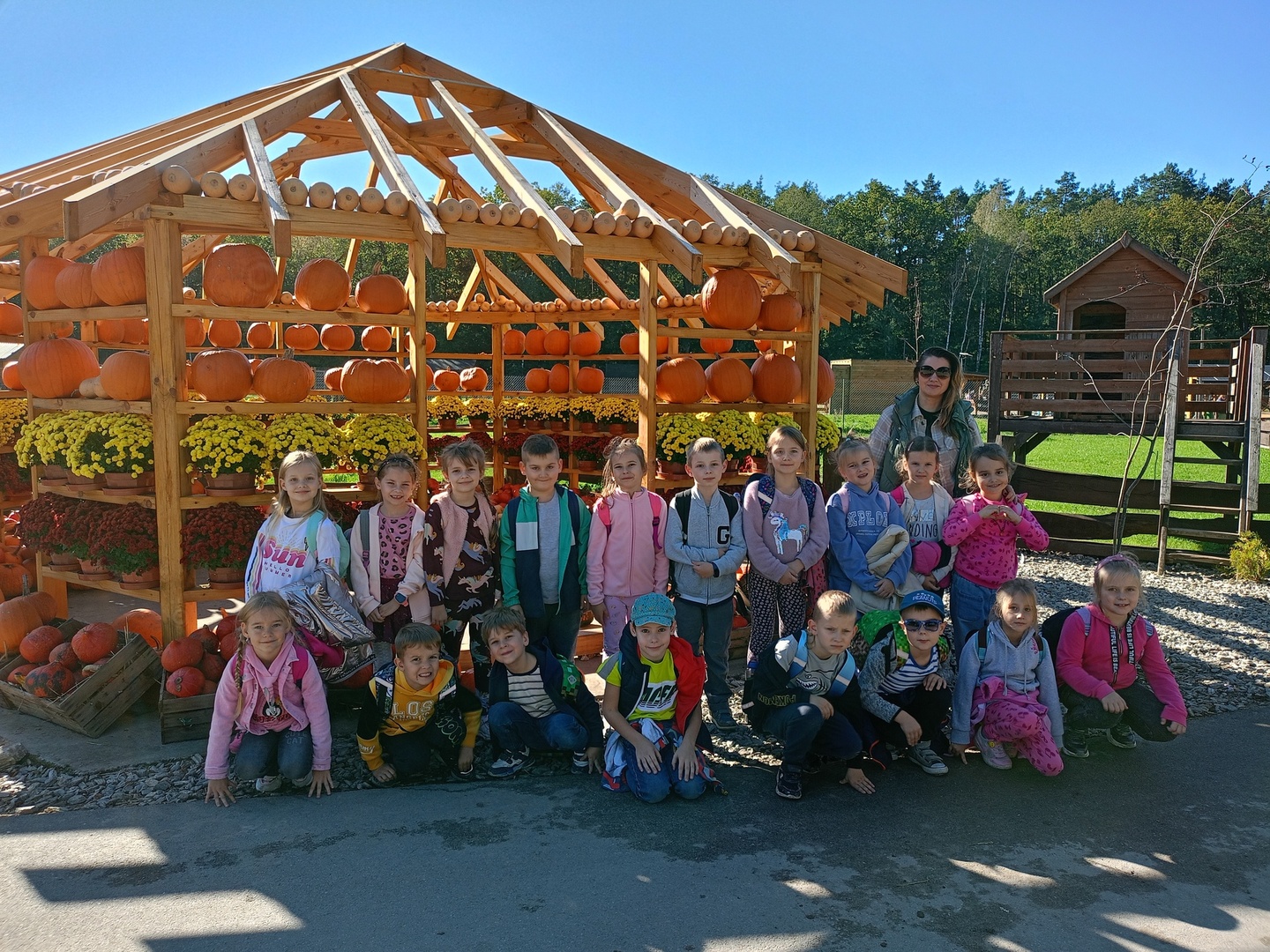 W dniu 10 października 2024 roku klasy 1b i 2a pod opieką pań Magdaleny Białas, Anny Lewandowskiej i Alicji Psut pojechały na wycieczkę do "Dobronianki". Jest to obiekt agroturystyczny, w którym można aktywnie odpocząć, poobcować z naturą i miło spędzić czas z przyjaciółmi. Pogoda dopisała wyśmienicie. Wizytę rozpoczęliśmy od zwiedzania zoo, zobaczyliśmy wiele gatunków zwierząt, karmiliśmy marchewką wielbłądy i lamy. Następnie zrelaksowaliśmy się przy ognisku z kiełbaskami. Na koniec uczestniczyliśmy w warsztatch i ozdabialiśmy dynie, które staną się naszą jesienną dekoracją.