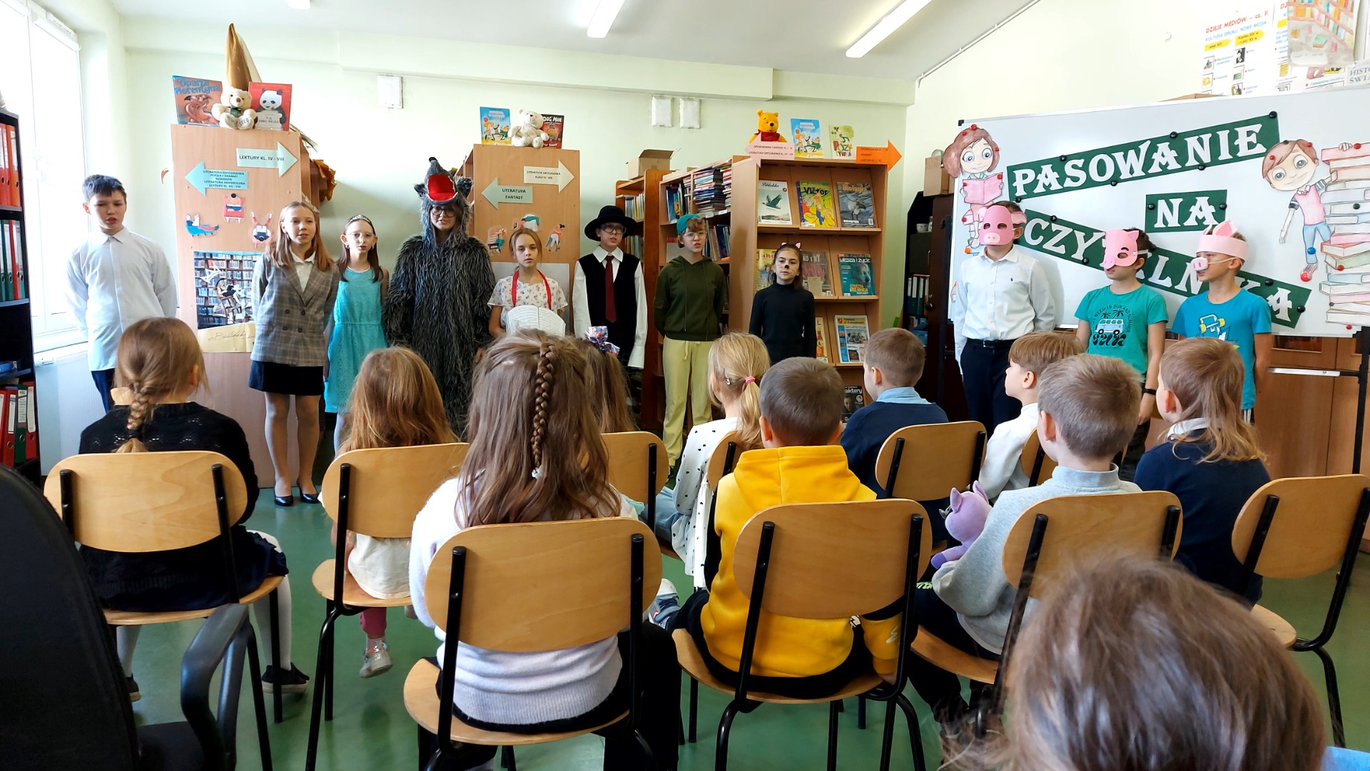 W dniu 25 listopada 2024 r. uczniowie klasy I a, I b i I c zostali pasowani na czytelników biblioteki szkolnej. Spotkanie rozpoczęto od powitania pierwszoklasistów i od inscenizacji przygotowanej przez uczniów z Koła Przyjaciół Biblioteki pod opieką nauczycielki bibliotekarki. Uzdolnieni szkolni aktorzy z klasy VI a i VI b zabrali pierwszaków w zaczarowany świat baśni. Wśród wyjątkowych gości znalazły się takie postaci, jak Książka, Lektor, Nauczycielka Bibliotekarka, Trzy Świnki. Marcel i kot Cukierek, Kopciuszek, Wilk, Detektyw Pozytywka. Wszyscy oni mieli niemały kłopot, ponieważ z powodu niedokończonego przez Lektora zaklęcia i z powodu potrącenia Książki przez bawiące się dzieci świat realny pomieszał się ze światem bajek i baśni. Bajkowe postaci nie mogły powrócić na karty książek. Na szczęście dzięki pomocy Detektywa Pozytywki i Kopciuszka wszystko dobrze się skończyło, a wymyślone postaci wróciły do swoich bajek. Po przedstawieniu najmłodsi czytelnicy złożyli przyrzeczenie, że wypożyczone książki będą kochać, czytać i szanować. Występujący szóstoklasiści zachęcali młodsze koleżanki i kolegów do przeżywania niecodziennych przygód z wybranymi bohaterami. Pierwszoklasiści z uwagą przyglądali się występom, słuchali skarg i próśb Książki, polubili niegroźnego Wilka, podziwiali spryt Detektywa Pozytywki i beztroską zabawę Świnek, a także Marcela goniącego swojego psotnego kota Cukierka. Tuż po pasowaniu najmłodsi czytelnicy otrzymali pamiątkowe dyplomy i zakładki do książek ufundowane przez radę rodziców.