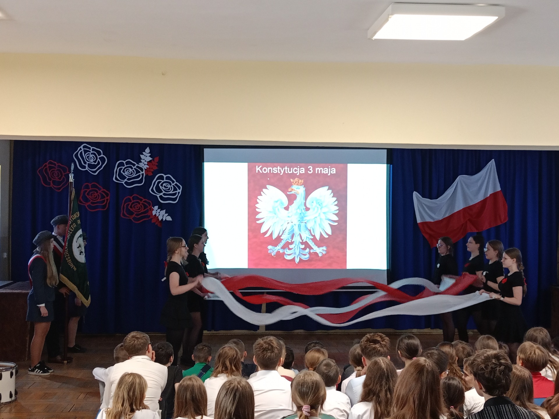 W dniu 6 maja w naszej szkole odbył się uroczysty apel upamiętniający uchwalenie Konstytucji 3 Maja – jednego z najważniejszych wydarzeń w historii Polski. Była to okazja do refleksji nad wartością wolności, patriotyzmu i narodowej tożsamości.