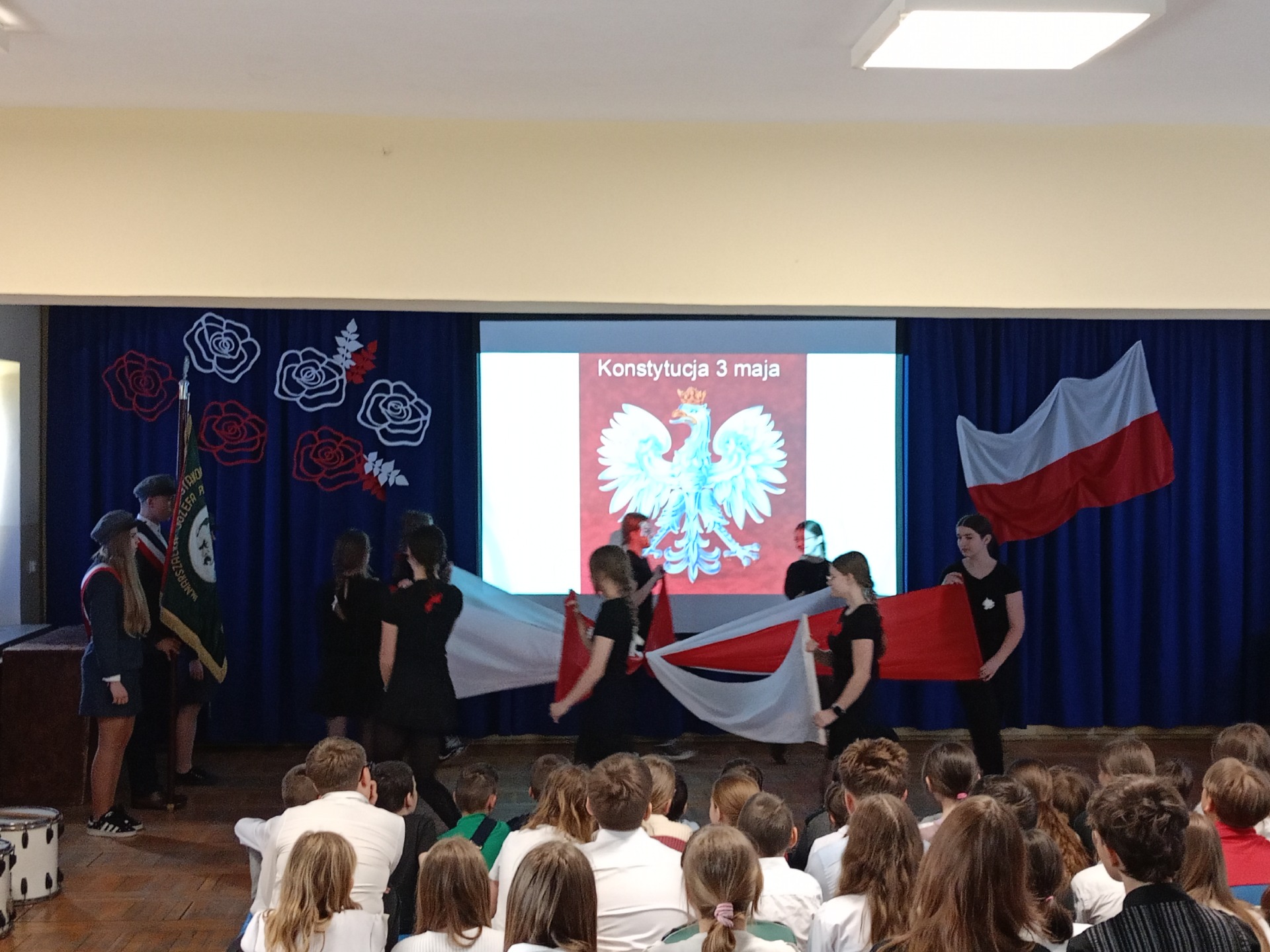 Uroczystość rozpoczęła się od symbolicznego tańca z szarfami w wykonaniu uczennic klas siódmych, który wprowadził zebranych w podniosły nastrój. Następnie zaprezentowano krótkie przedstawienie przybliżające wydarzenia sprzed ponad 200 lat, kiedy to w 1791 roku uchwalono pierwszą w Europie, a drugą na świecie nowoczesną konstytucję.