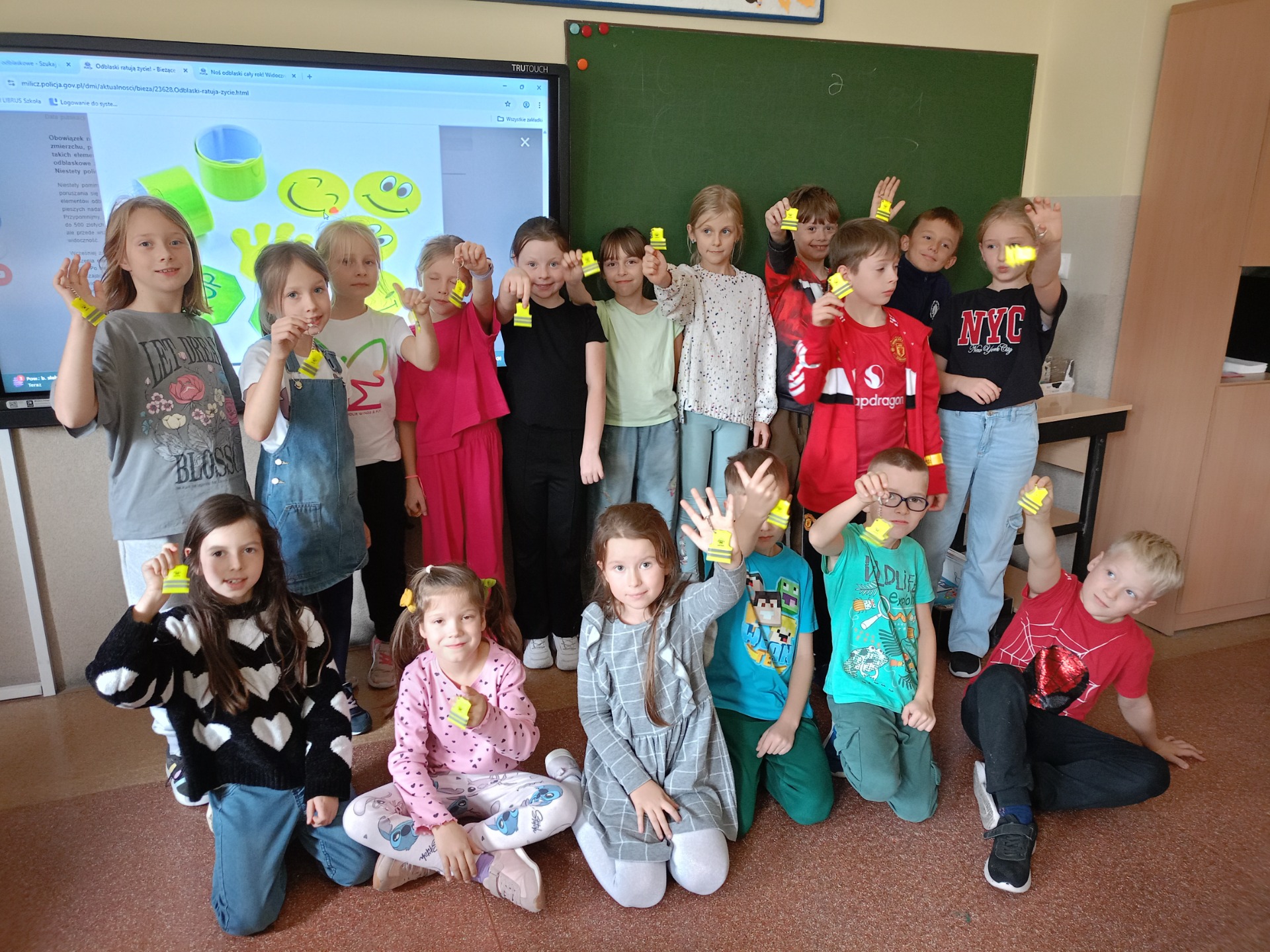 Dzieci z dumą prezentują swoje kolorowe odblaski, które noszą na tornistrach, kurtkach i butach. Chętnie też zachęcają starszych kolegów, rodziców i mieszkańców, by również pamiętali o odblaskach.